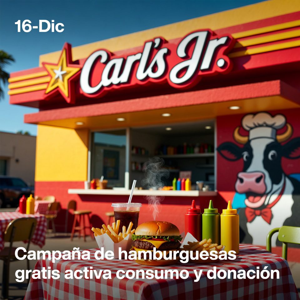 La cadena de comida rápida Carl’s Jr anunció una dinámica para regalar hamburguesas el 16 de diciembre, con el objetivo de atraer clientes y posicionar una campaña de temporada. La actividad se presentó como promoción limitada y sujeta a reglas de participación en puntos de venta. Se recomendó a consumidores revisar horarios y condiciones antes de acudir, para evitar aglomeraciones y filas prolongadas.