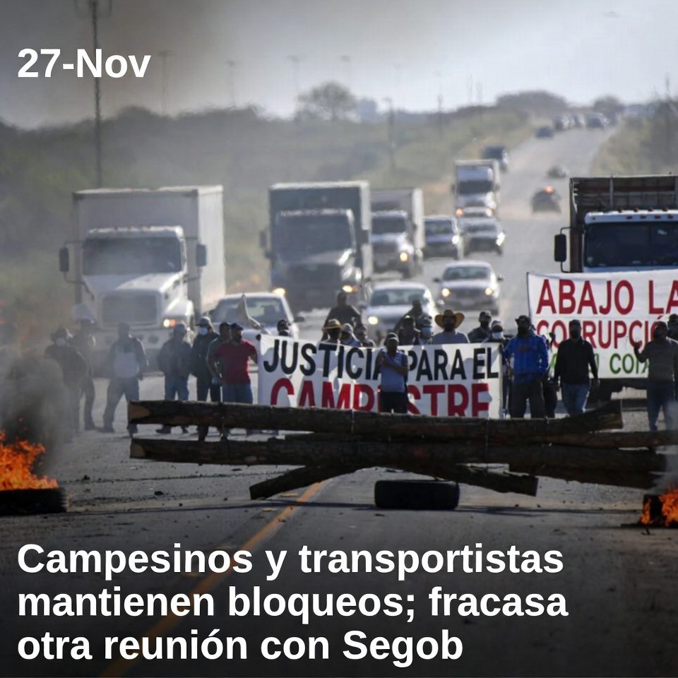 Este 27 de noviembre continúan los bloqueos en carreteras, aduanas y accesos a varias ciudades de México por parte de transportistas y productores del campo, que ya suman varios días de protestas. Los cierres afectan al menos a decenas de tramos en más de 20 estados, con impacto en el flujo de mercancías, pasajeros y servicios básicos. El movimiento exige seguridad en carreteras y precios justos para sus cosechas, en especial para el maíz, en un contexto de alza de costos e inseguridad en rutas clave.