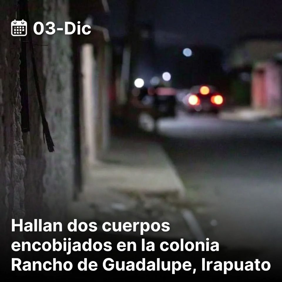 Medios locales reportaron que este martes fueron localizados dos cuerpos envueltos en cobijas en la colonia Rancho de Guadalupe, en Irapuato. De acuerdo con la información preliminar, vecinos alertaron a las autoridades tras ver los bultos en la vía pública; al llegar, elementos de seguridad confirmaron el hallazgo y acordonaron la zona para permitir el trabajo de peritos y la unidad de traslado de indicios.