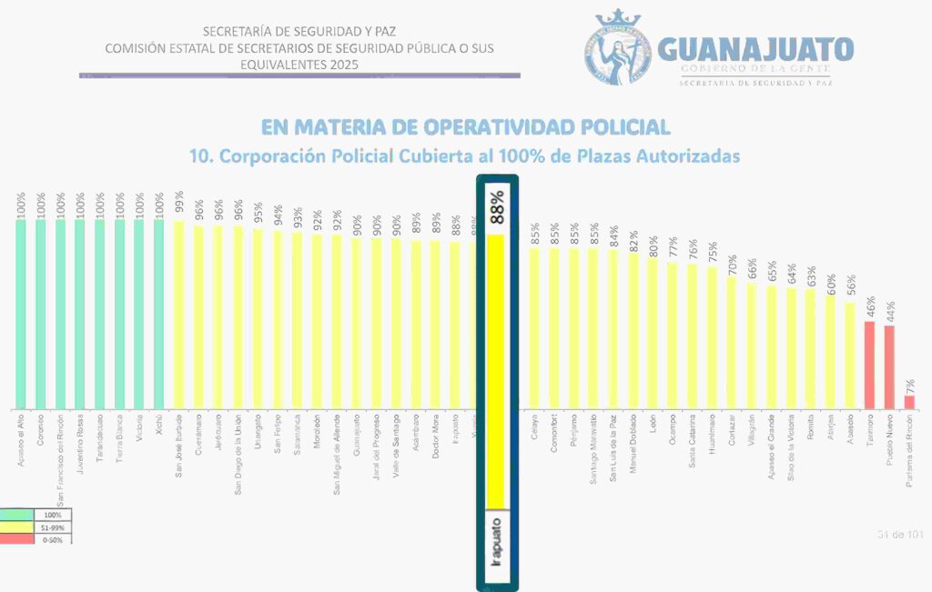 Aunque, la realidad apunta a que, en Irapuato, se tiene un déficit del 12% de elementos de policía municipal, lo que es dado a conocer por los resultados de la Estrategia Integral de Seguridad Pública en cuanto al cumplimiento de Irapuato, en materia de seguridad pública que arroja esta cifra.