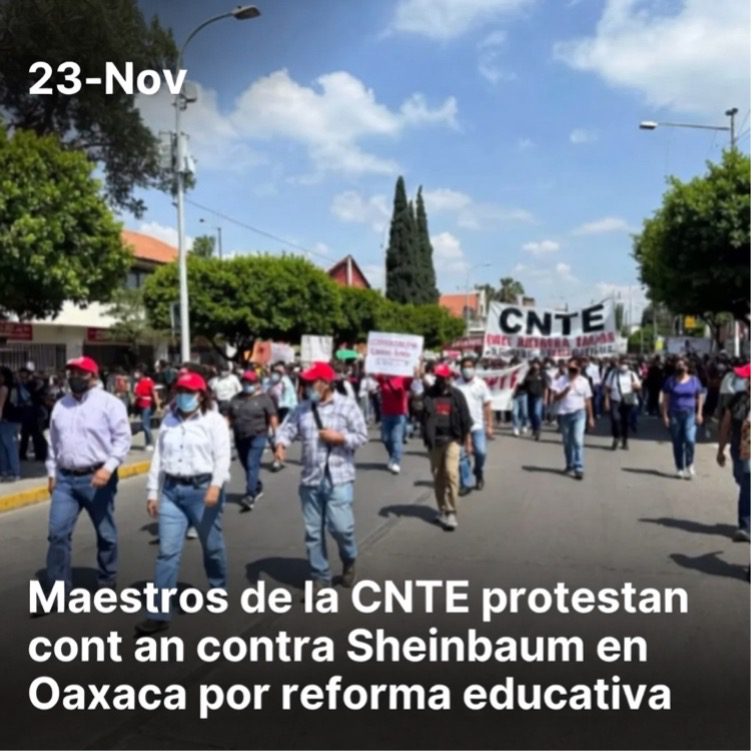 En Oaxaca, maestros disidentes de la sección 22 de la CNTE realizaron una protesta durante el arranque del programa “Plan Lázaro Cárdenas”, encabezado por la presidenta Claudia Sheinbaum en la región Mixteca. Los docentes se manifestaron en rechazo a los lineamientos de la reforma educativa impulsada por el nuevo gobierno, pues consideran que mantiene esquemas de evaluación y control administrativo que ya habían cuestionado en sexenios anteriores. Aunque la protesta no impidió el evento, obligó a reforzar los dispositivos de seguridad y a modificar algunos accesos.
