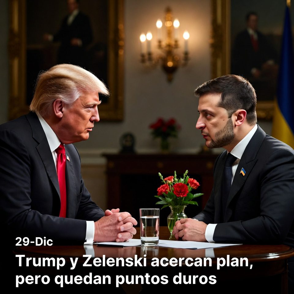 Estados Unidos y Ucrania reportaron avances en conversaciones para un posible acuerdo de paz, tras una reunión de alto nivel entre Donald Trump y Volodímir Zelenski. Se habló de garantías de seguridad de largo plazo y de mecanismos de supervisión, aunque persistieron diferencias sobre territorios en disputa. Rusia, por su parte, mantuvo condiciones fuertes sobre Donbás y otros puntos, lo que complica un cierre rápido.