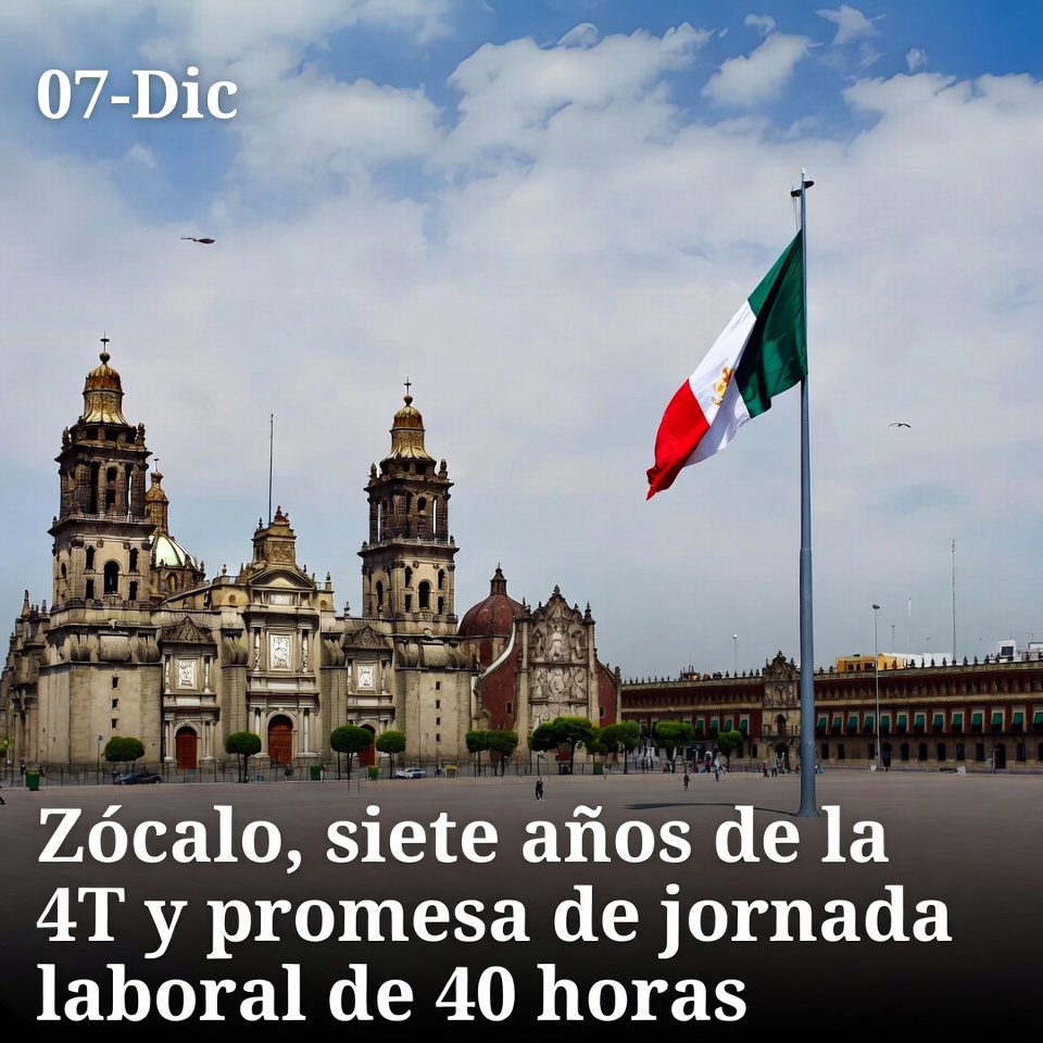 La presidenta Sheinbaum encabezó la conmemoración por siete años de gobiernos de la 4T en el Zócalo capitalino. En su mensaje, además de defender los programas sociales, destacó que envió al Congreso una reforma para reducir gradualmente la jornada laboral hasta llegar a 40 horas semanales en 2030.